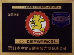 中古車販売を営むために必要な資格である古物商について定めています。資格のある販売店で当会((社)日本中古自動車販売協会連合会)の会員である販売店には下の写真ような「標識」が掲示されています。